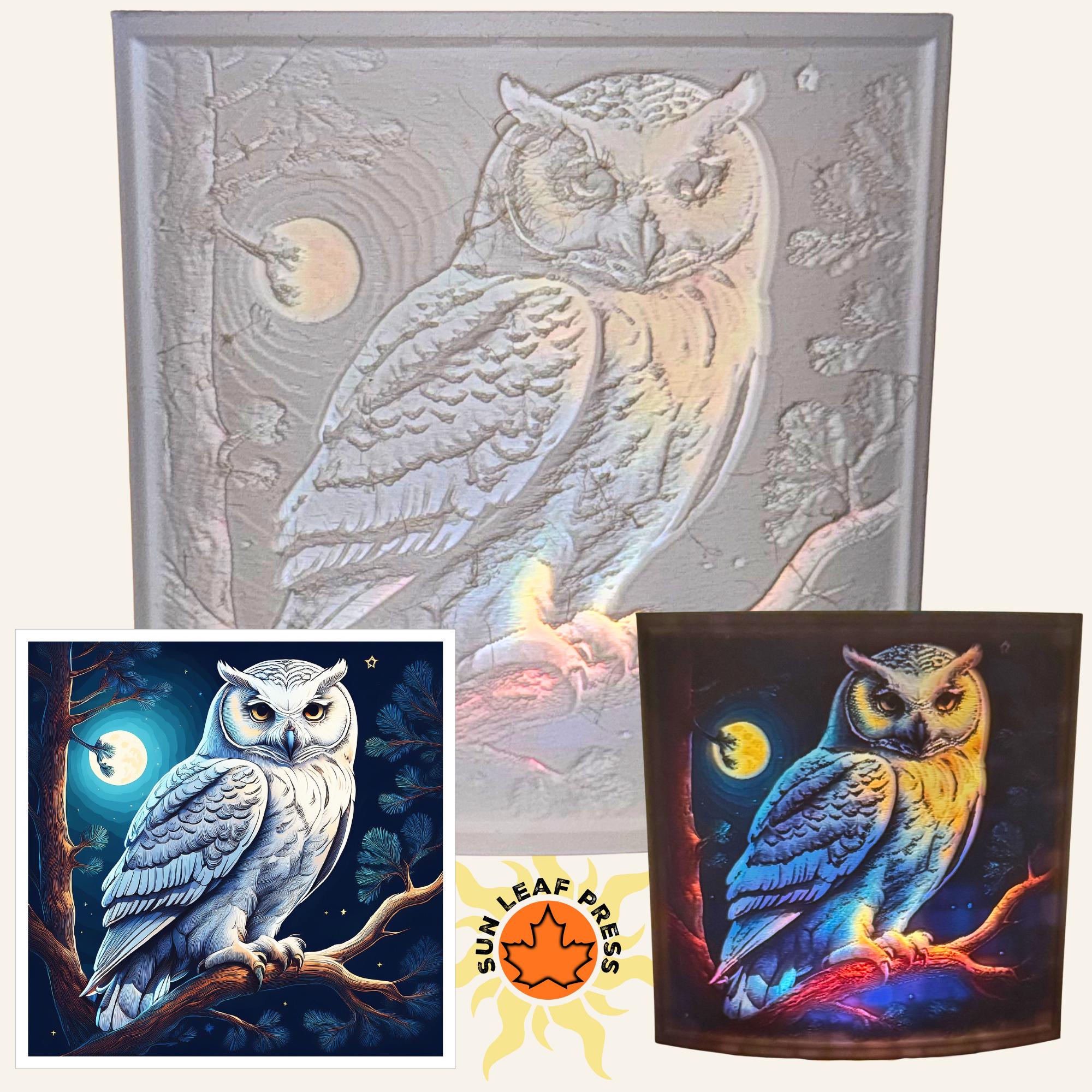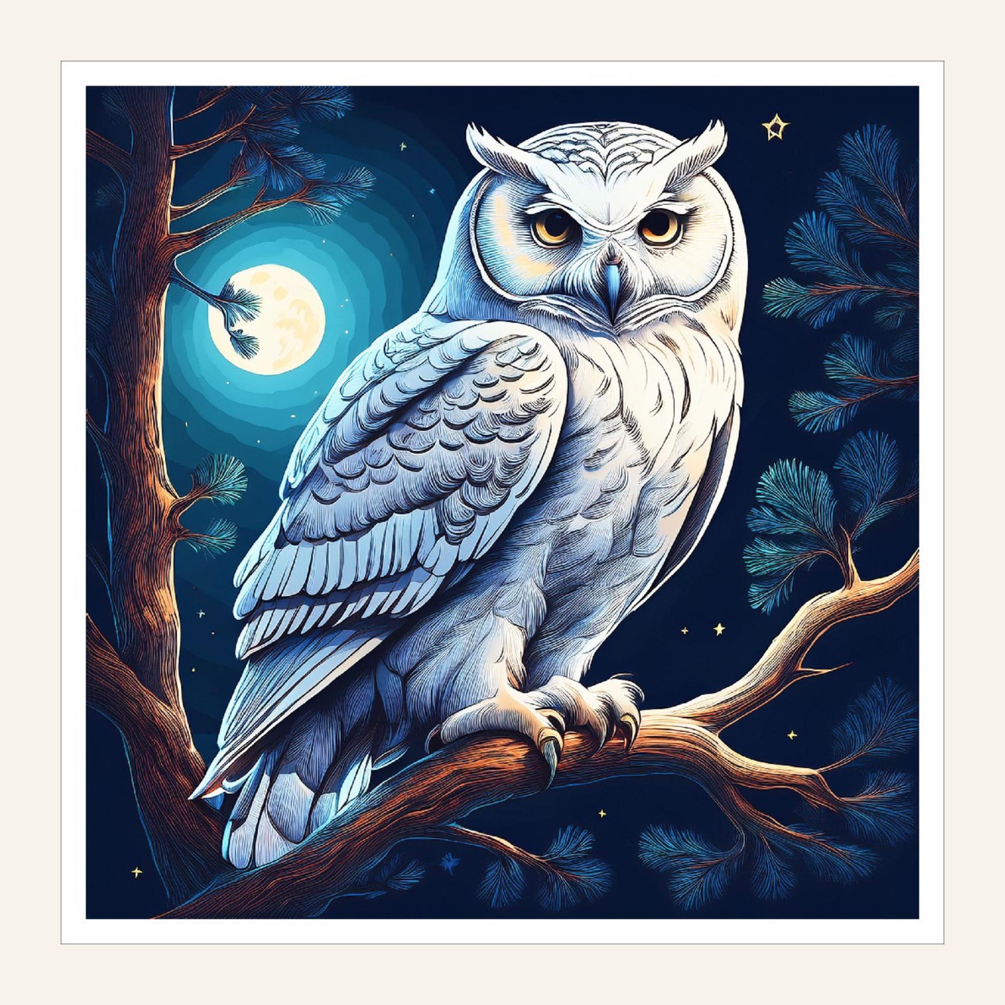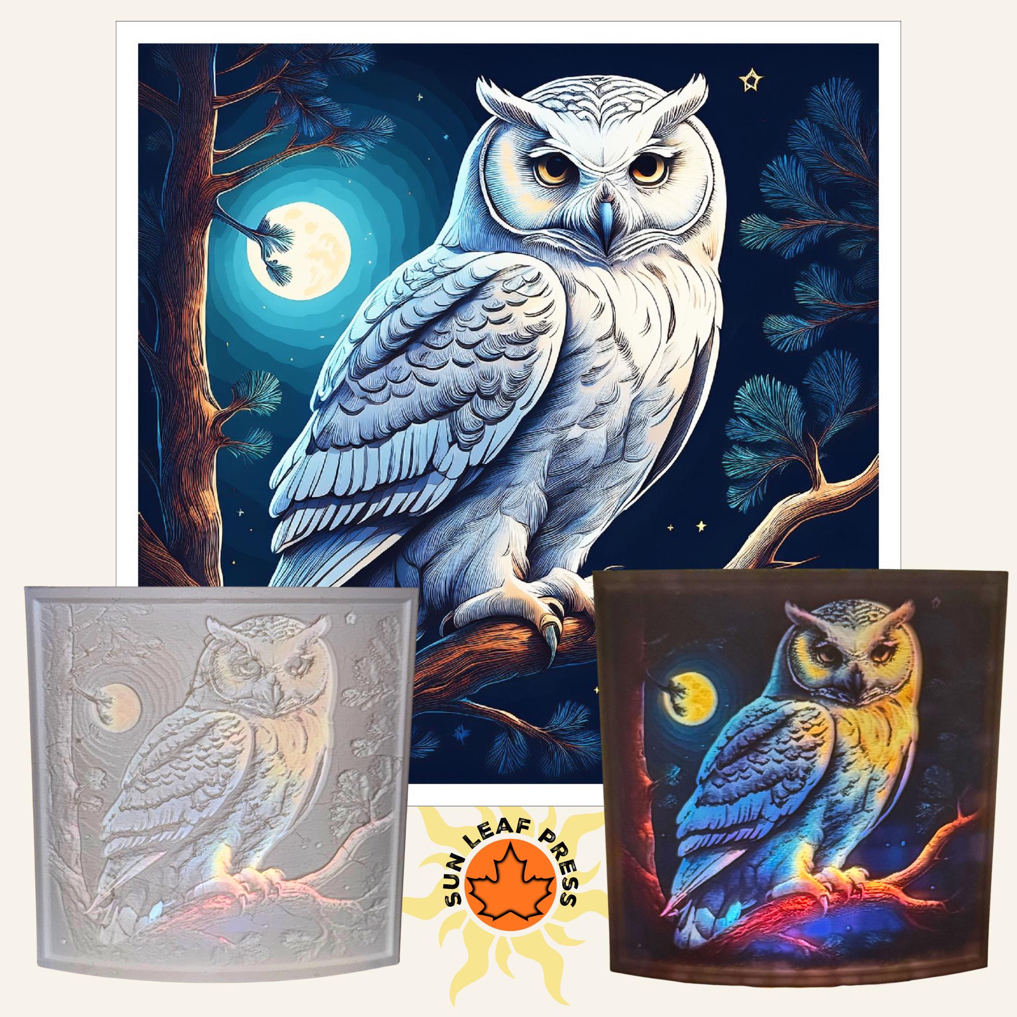 • Beautifully detailed snowy owl artwork illuminated from behind, featuring intricate feather details and piercing amber eyes against a moonlit forest background