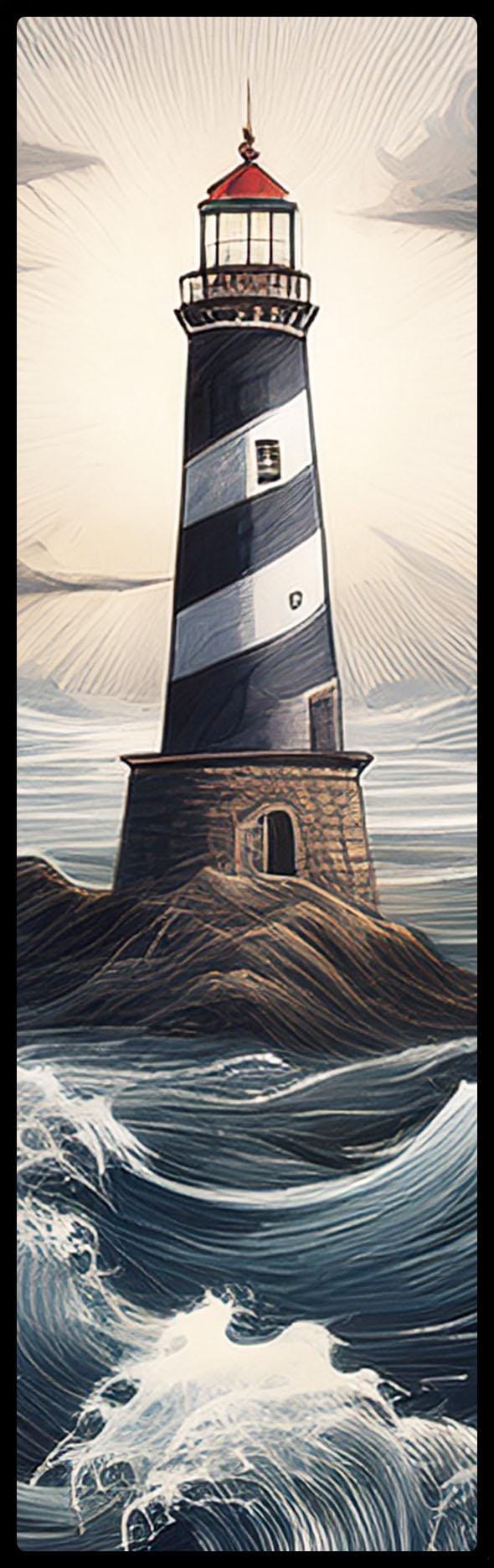 • Features a detailed black and white striped lighthouse, complete with rocky outcrop, waves, and light beams